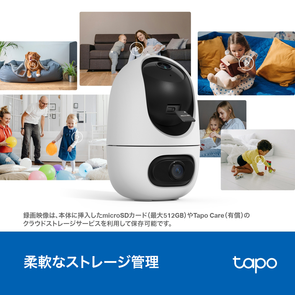 - 安全なローカル&クラウドストレージ:録画映像は、本体に挿入したmicroSDカード(最大512GB/別売り)†や30日間の動画履歴を利用できるTapo Care(有償)のクラウドストレージサービス‡を利用して保存可能です。
