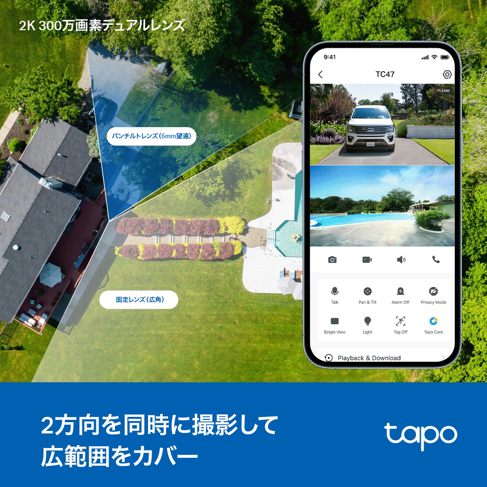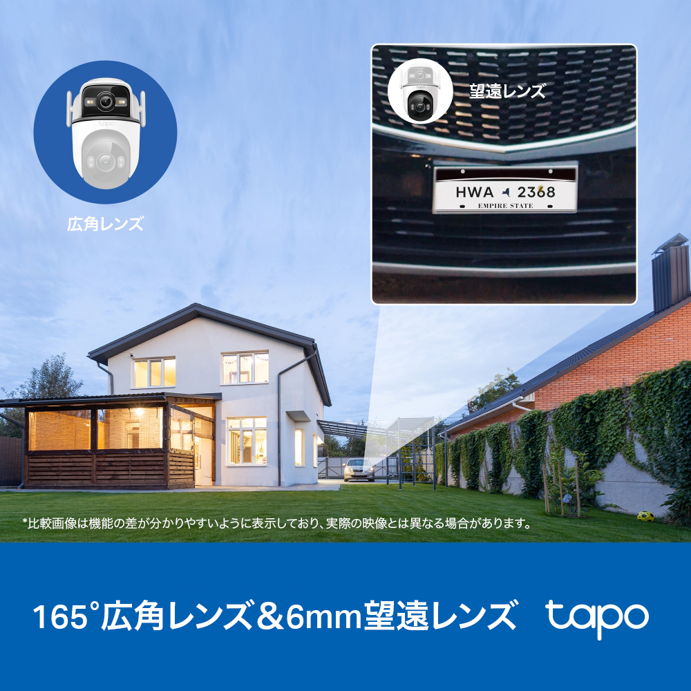 - デュアルレンズ搭載:165°の視野角を持つ固定レンズ(広角)とパンチルトレンズ(6mm望遠)を備え、広範囲を細部までクリアに捉えます。