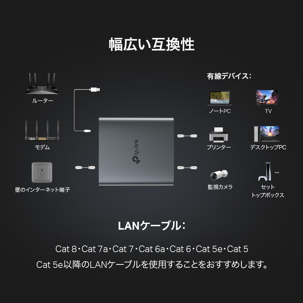 | 互換性 | デバイス:ハブ・スイッチ・ルーター・監視カメラ・PC等 LANケーブル:Cat 8・Cat 7a・Cat 7・Cat 6a・Cat 6・Cat 5e・Cat 5 |