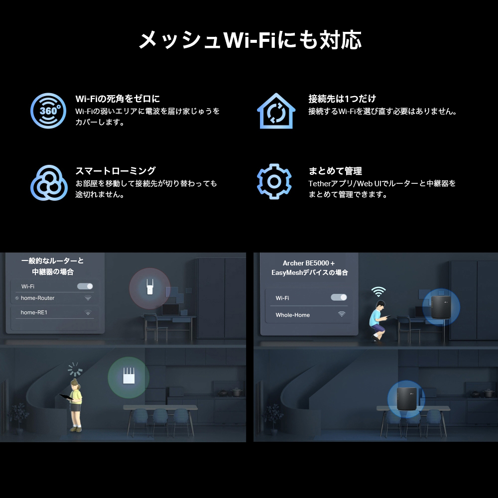 「Archer BE5000」はEasyMeshと互換性があるので、対応のルーター/中継器と連携させることで、家じゅうを包み込むマルチギガのメッシュネットワークを構築できます。5