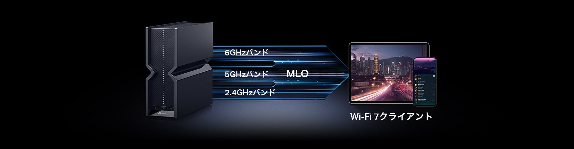 Archer BE550 Proの2.4GHz・5GHzおよび6GHzバンドに同時接続した際に最大9.7Gbpsの速度を実現するには、Wi-Fi 7クライアントがMLO(Multi-Link Operation)と6GHzバンドに対応している必要があります。