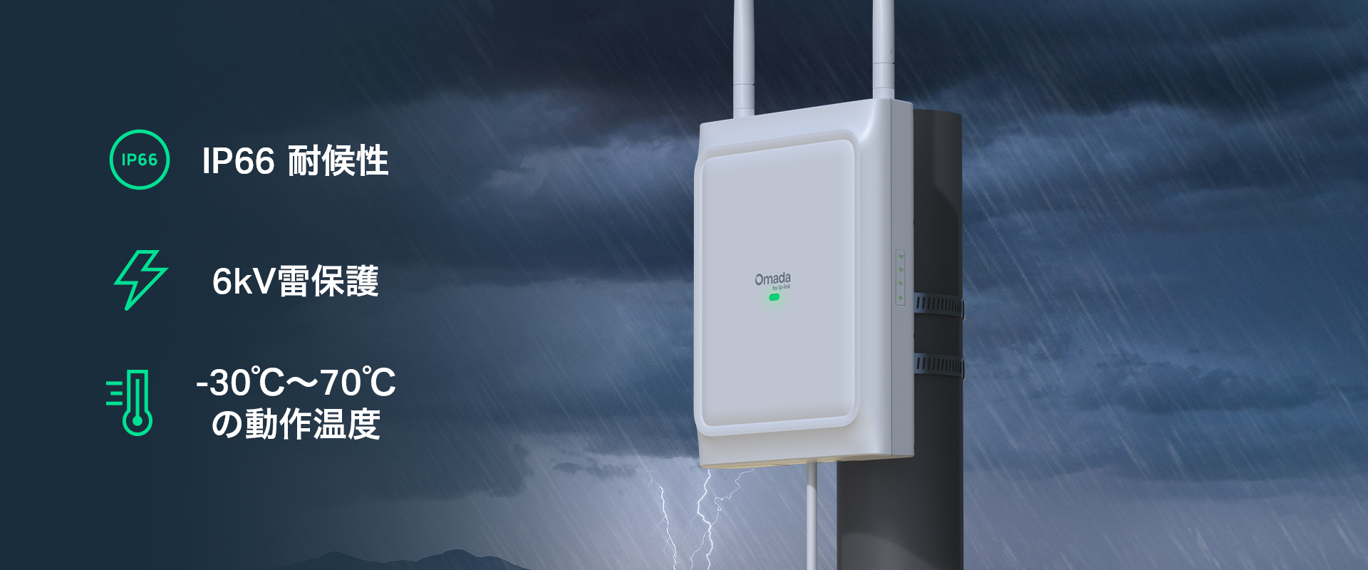 Omadaシリーズ初となる指向性/全方向性アンテナの両方を搭載し、用途に応じてモードの切り替えが可能です。広範囲のカバーからピンポイントの通信まで柔軟に対応し、倉庫や工場等、広大なスペースを持つ現場でも快適なWi-Fiネットワークの構築を実現。屋外での使用に適したIP66の防水・防塵性能や6kVの雷保護も備えているため、多様な環境で活用できます。