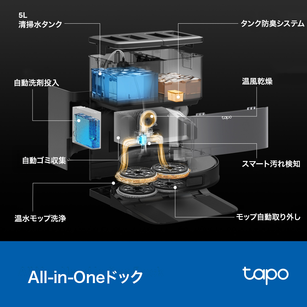 | 製品構成 | ロボット掃除機(フィルター&サイドブラシ取り付け済み) All-in-Oneドック:(ゴミ収集用紙パック取り付け済み) 3Lゴミ収集用紙パック(交換用) 防臭パーツ Tapo専用洗剤 モップ用アタッチメント ベース 電源コード 取扱説明書 |