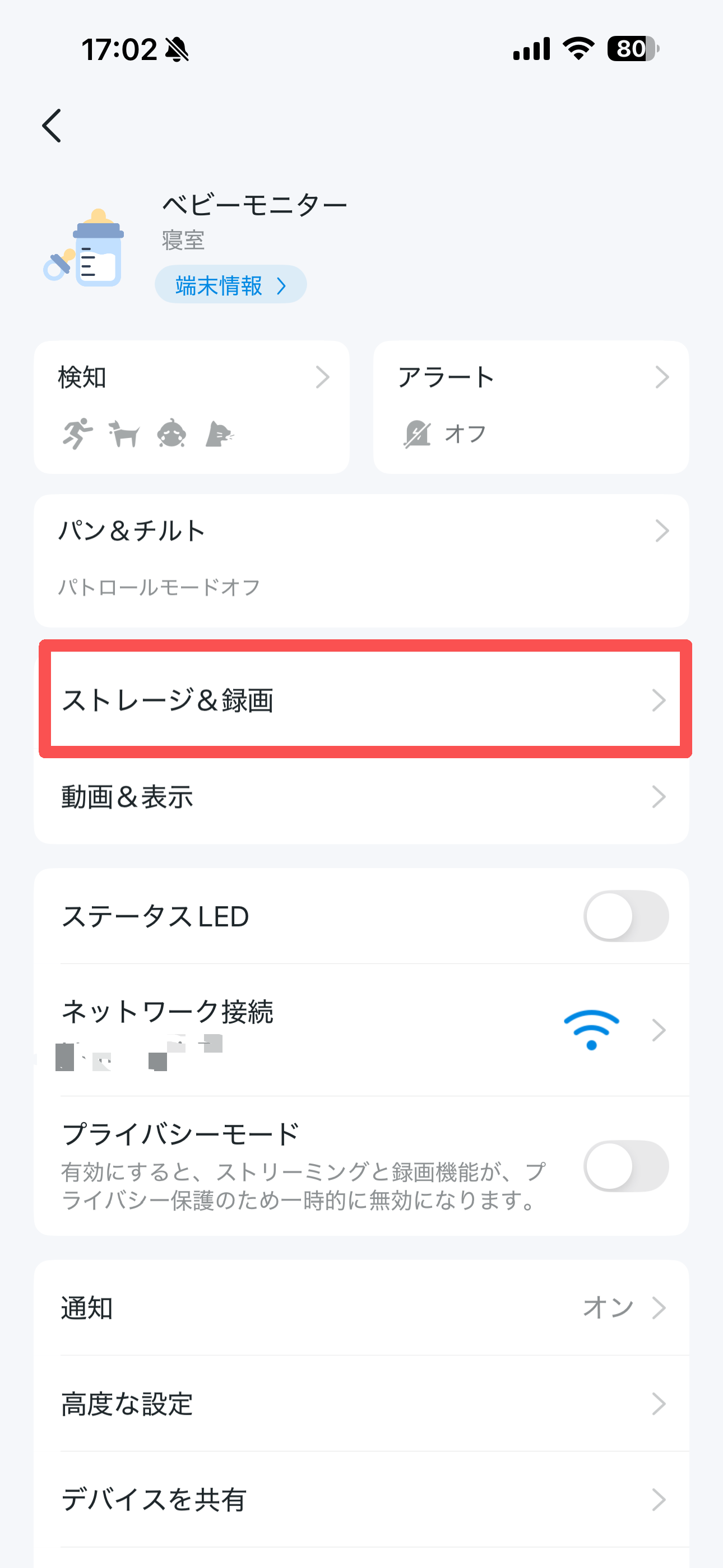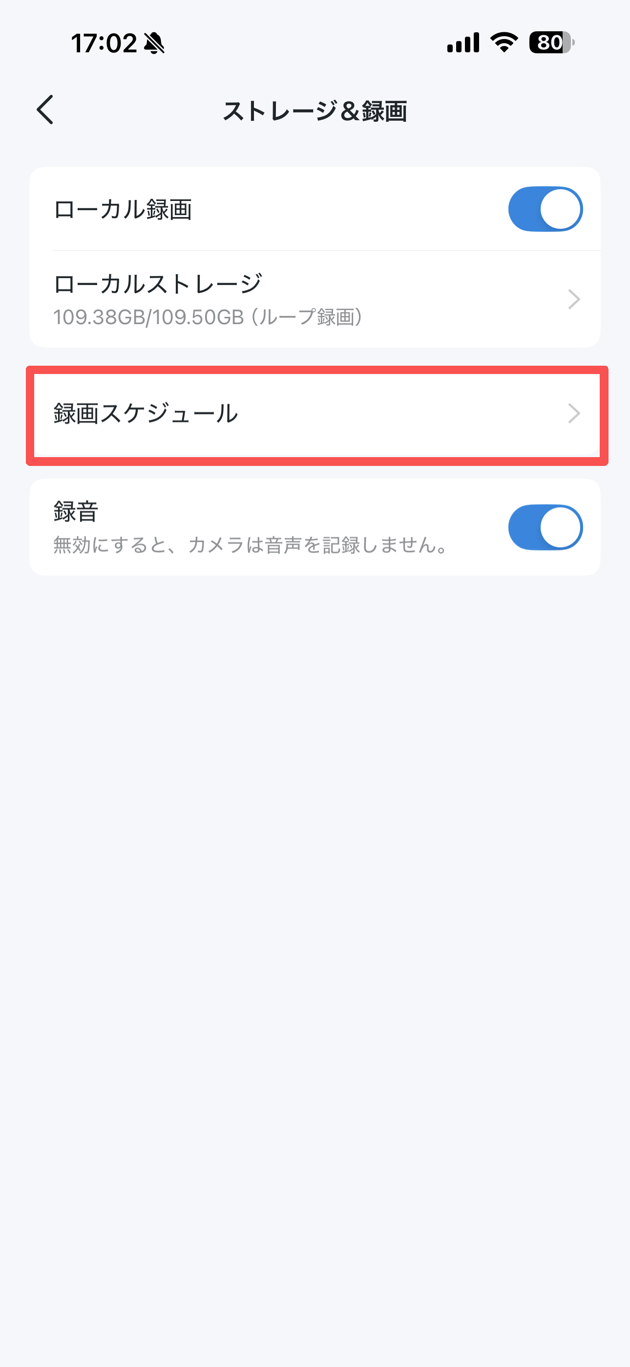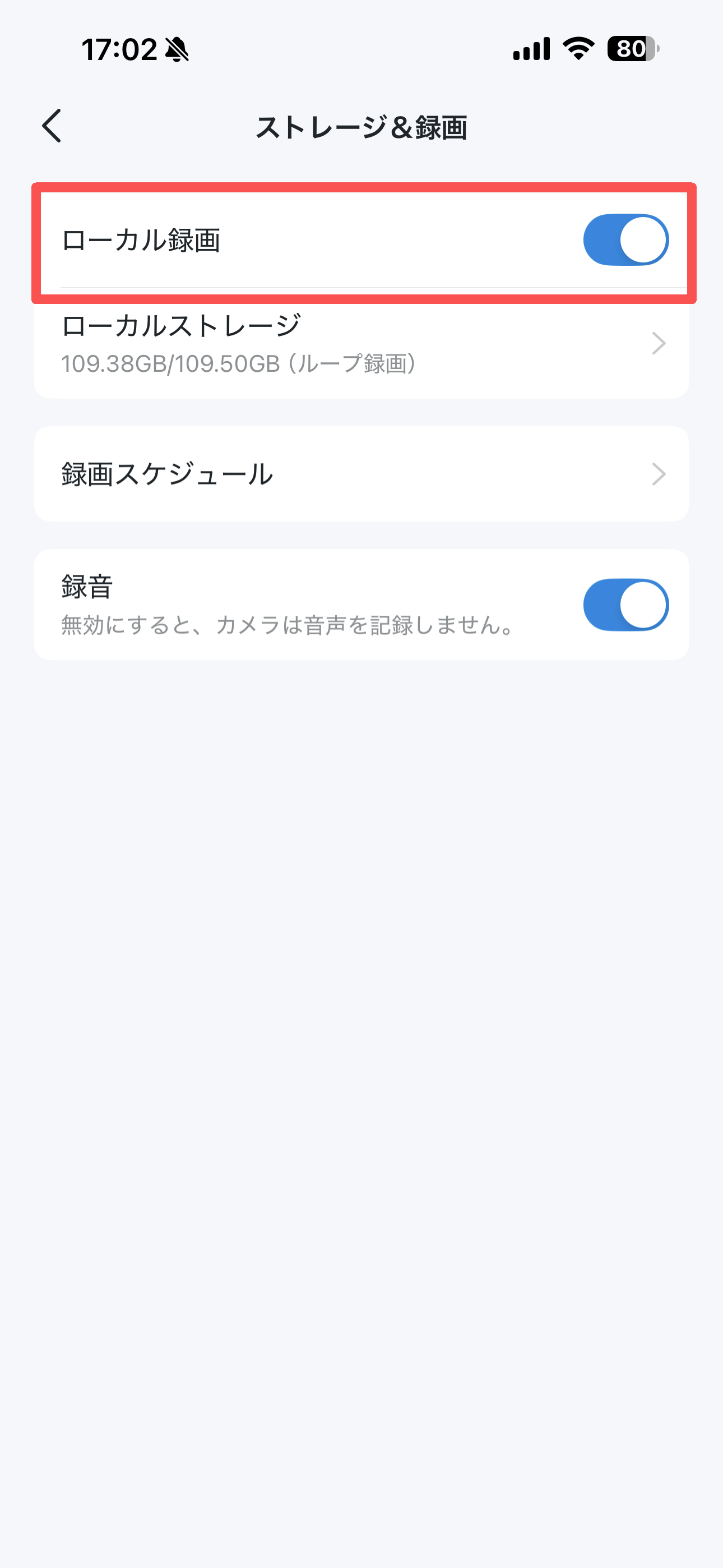 - ストレージ&録画をタップし、microSDへのローカル録画機能が有効になっていることを確認します。
