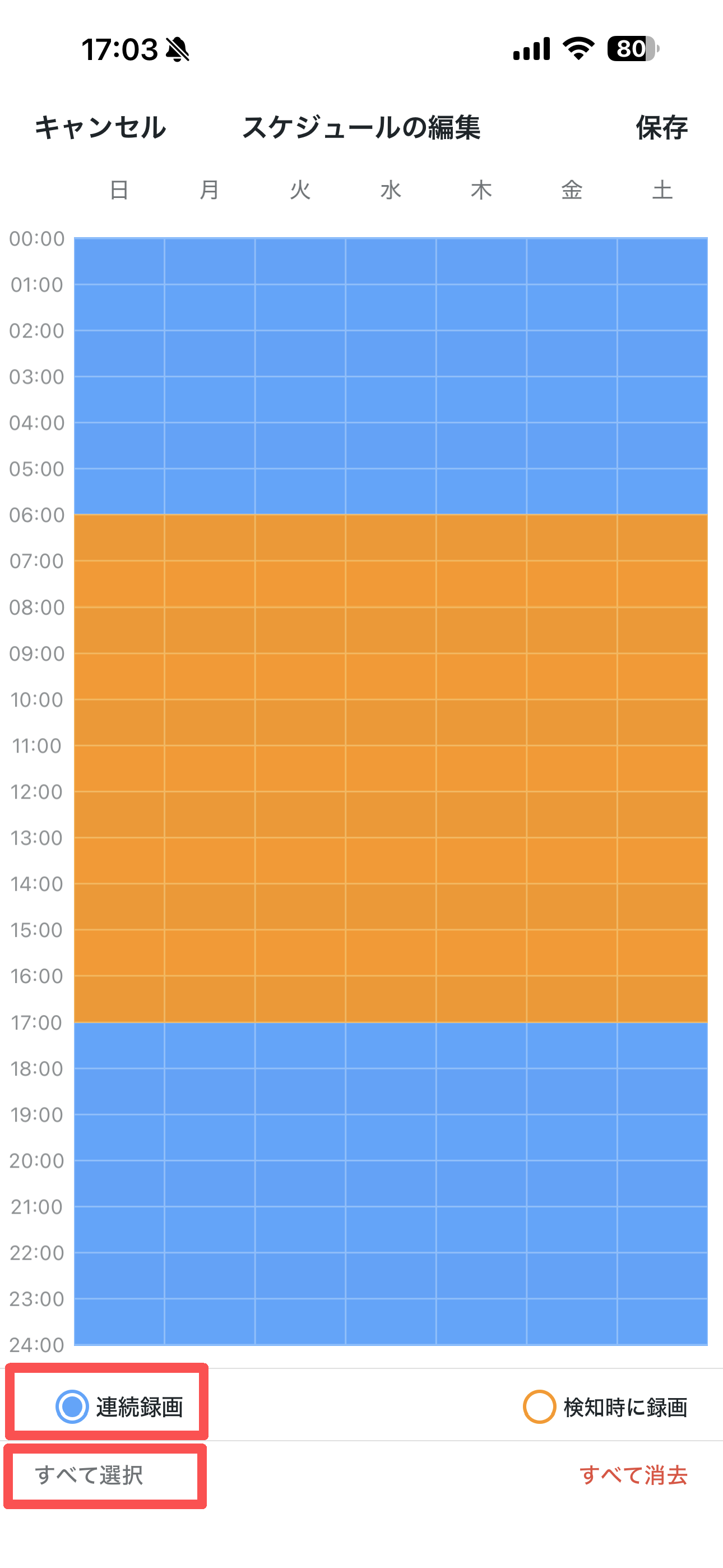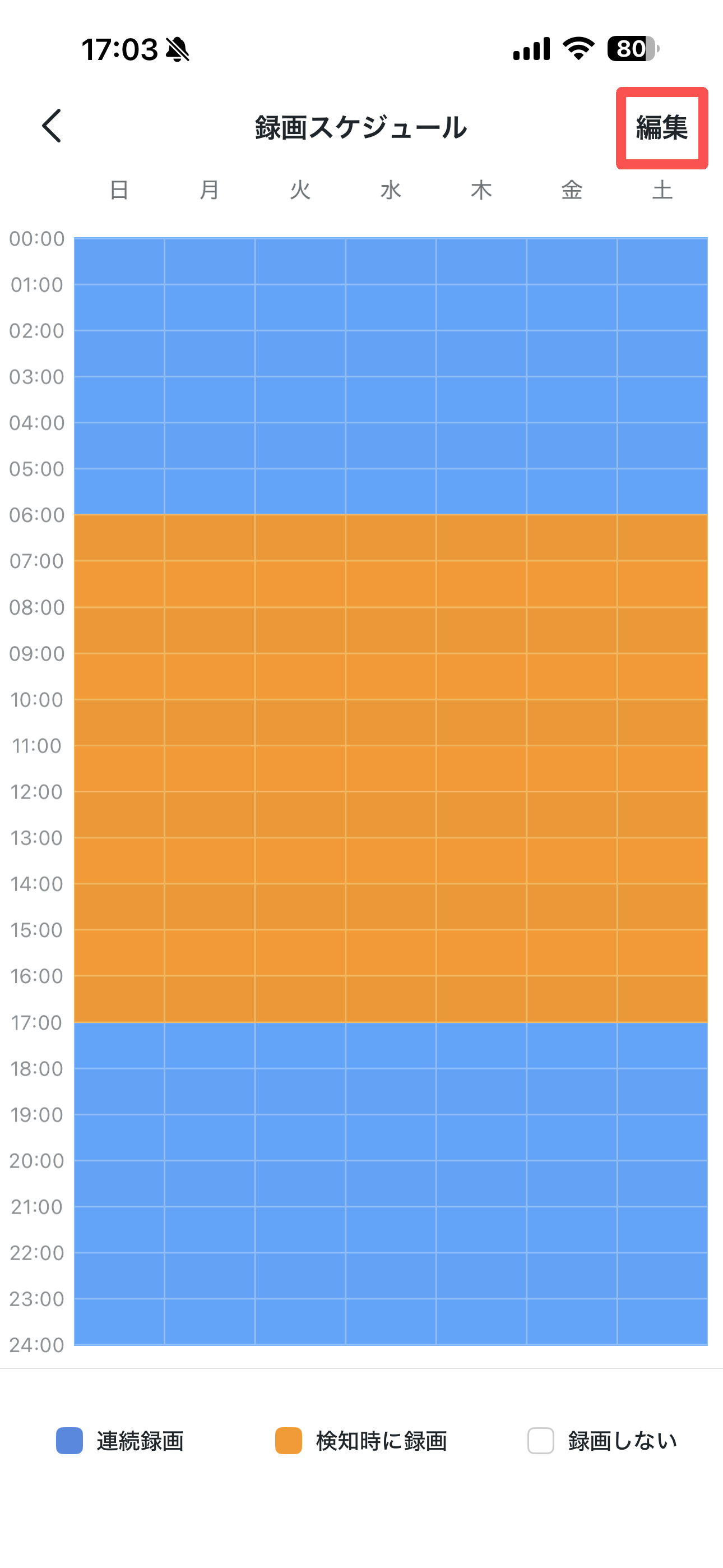 録画スケジュールページで編集をタップすると、連続録画と検出録画のスケジュールを変更できます。