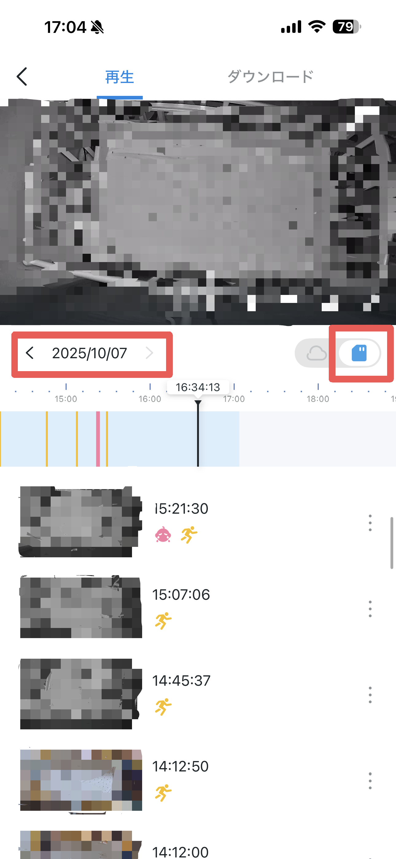 カメラのライブビューページで、再生&ダウンロードをタップし、再生ページでSDカードアイコンを選択し、日付を選択すると、タイムラインをドラッグして連続録画した映像を表示できます。