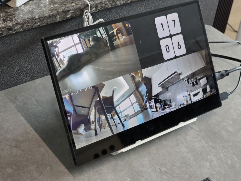 타포 H500에 휴대용 모니터를 연결하면 본격적인 NVR로 활용할 수 있다. 타포 H500의 USB Type-C 단자로 휴대용 모니터에 전원을 공급하고 HDMI 출력 기능을 사용해보니, 실시간으로 카메라의 라이브뷰를 확인할 수 있었다. 참고로 현재 시간을 표시하는 기능도 제공된다.