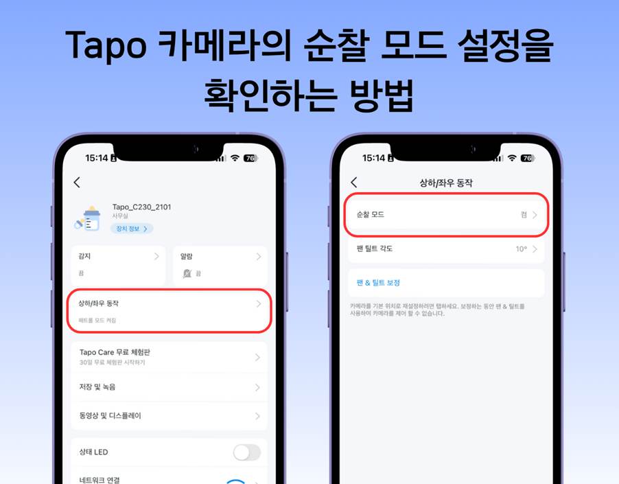 • 확인 경로: Tapo 앱 > 디바이스 설정 > 상하/좌우 동작 > 순찰 모드