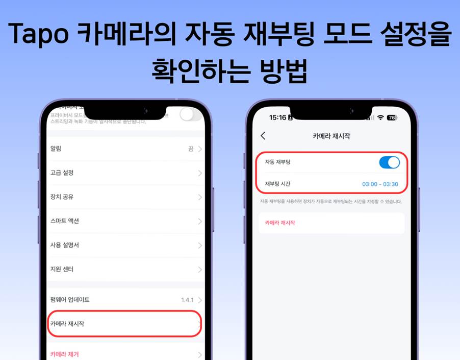 • 확인 경로: Tapo 앱 > 디바이스 설정 > 카메라 재시작