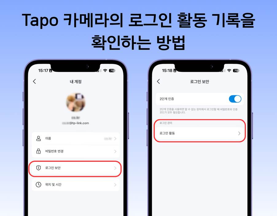• 확인 경로: Tapo 앱 > 나 > 계정 보기 > 로그인 보안 > 로그인 활동