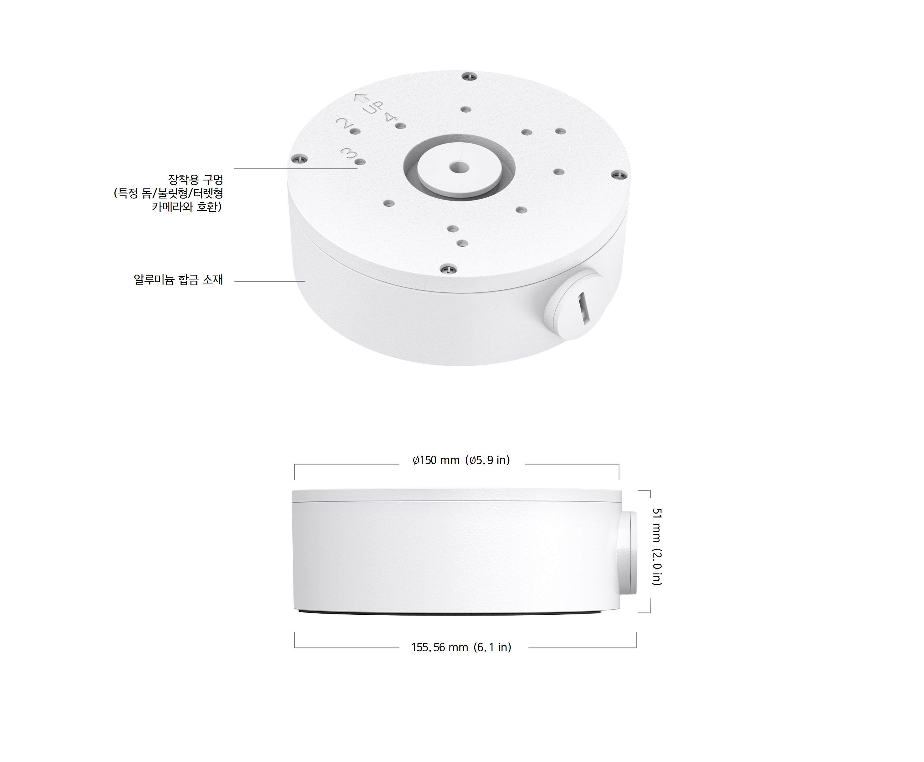 | 제품 크기 (L x W x H) | 본체: ∅150 × 51 mm 전체: 155.56 × 150 × 51 mm (케이블 인입구 포함) |