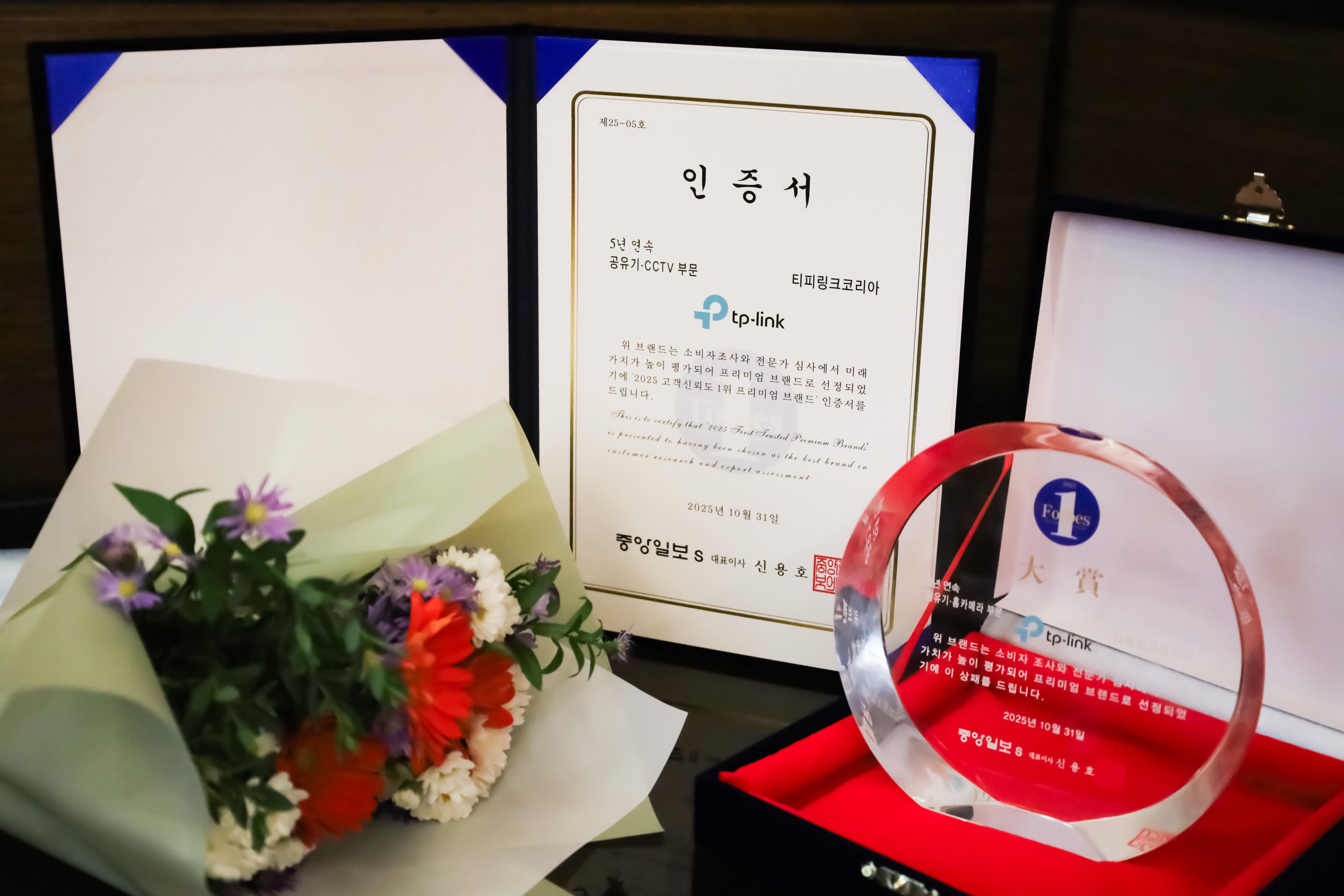 [2025년 10월 31일] 글로벌 네트워킹 및 스마트홈 솔루션 기업 티피링크(TP-Link)는 10월 31일 서울 마포구 스탠포드호텔에서 열린 ‘2025 고객신뢰도 1위 프리미엄 브랜드 대상’ 시상식에서 ‘공유기’ 및 ‘CCTV’ 부문 5년 연속 대상을 수상했다고 밝혔다.