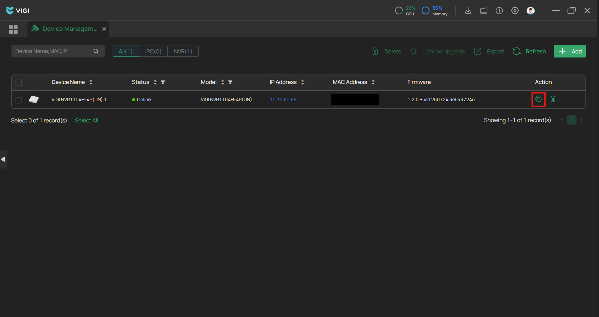 단계 2. VIGI PC Client 에서 해당 장치의 '장치 구성'(우측 톱니바퀴)에 인입합니다.
