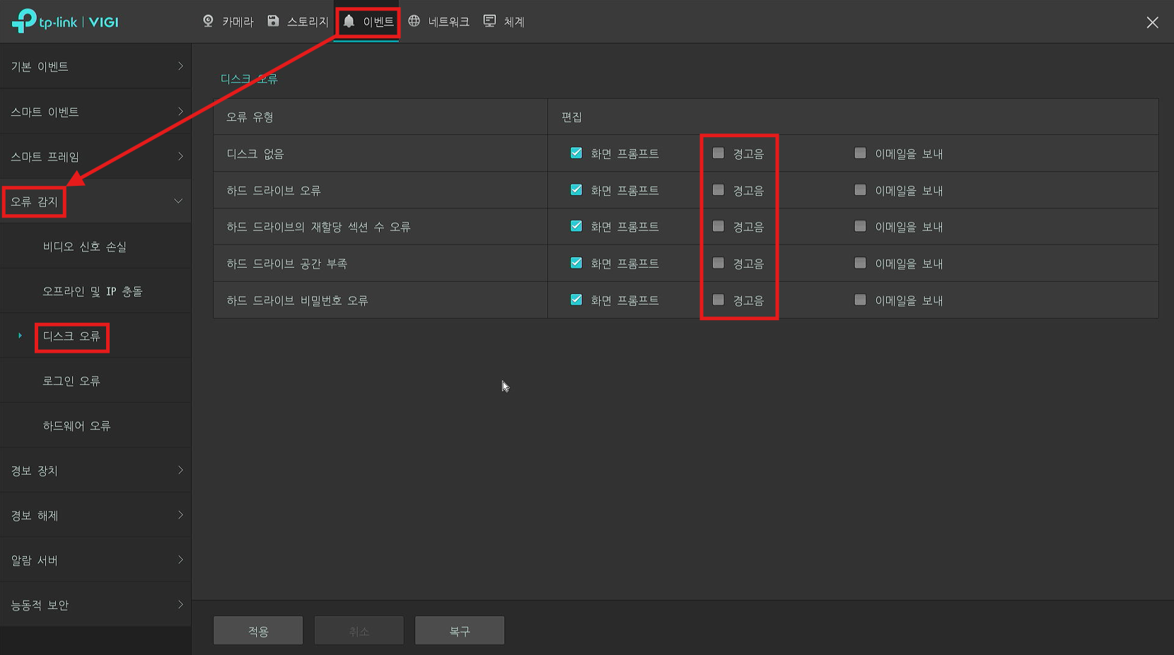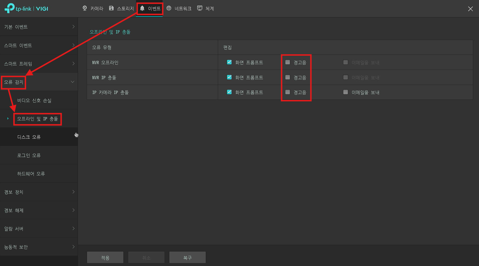 단계 2. 상단의 이벤트 - 좌측의 오류 감지 탭 내의 '오프라인 및 IP 충돌' 혹은 '디스크 오류'로 인입합니다.