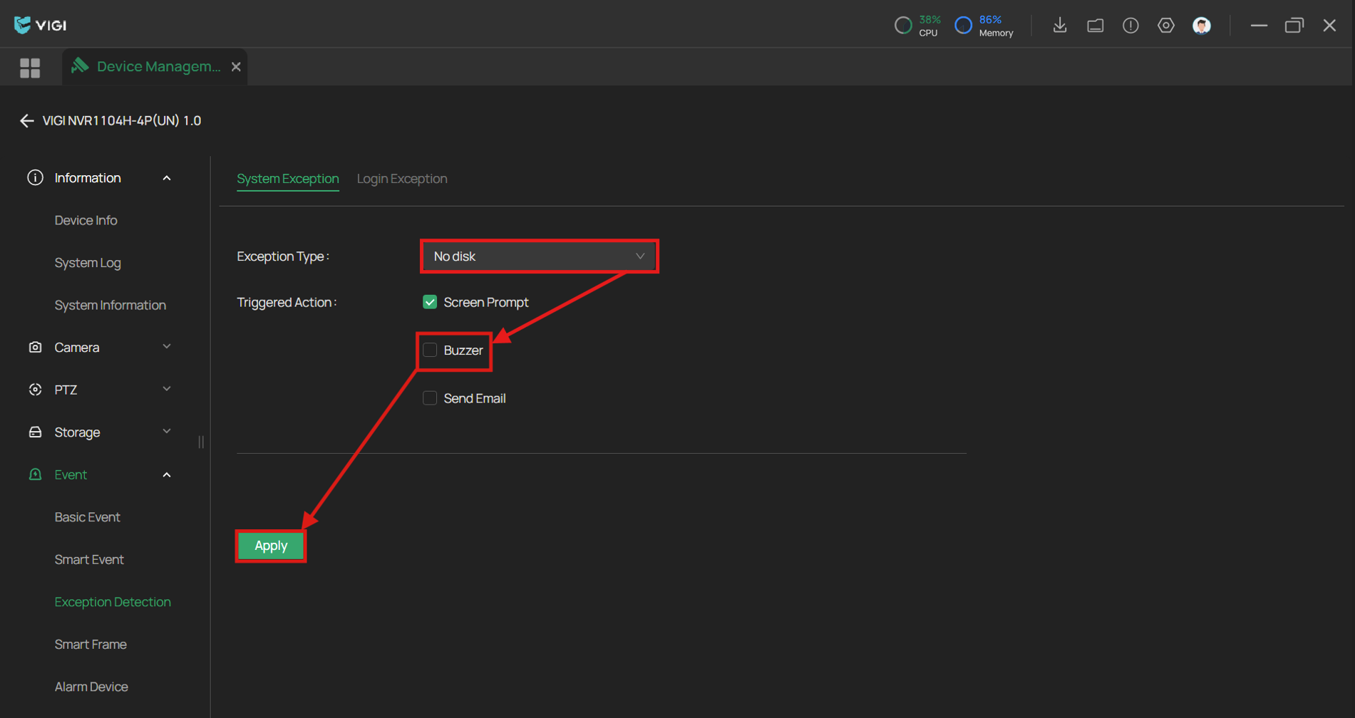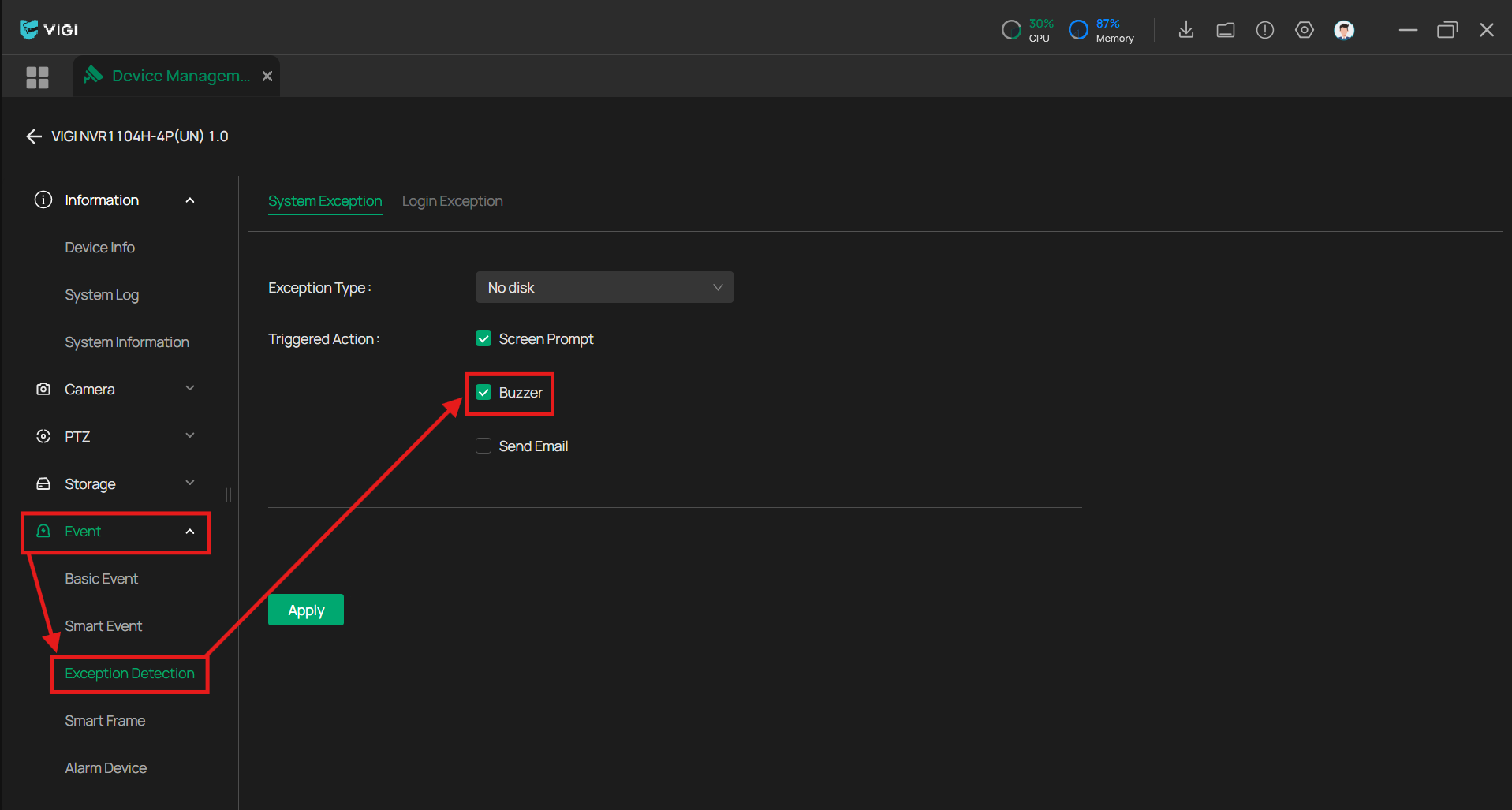 단계 4. 오류 유형을 확인하고 '경보음(Buzzer)'을 비활성화 한 채로 '적용(Apply)' 을 누릅니다.