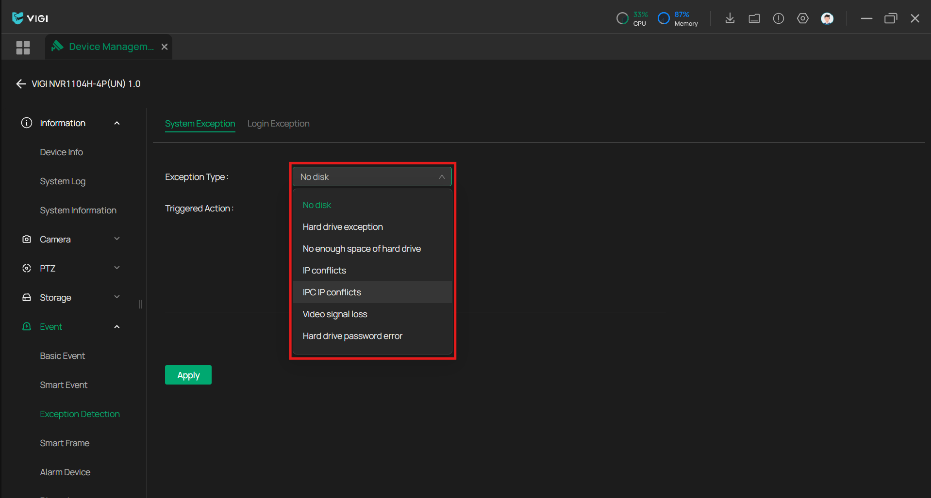 단계 3. '장치 구성' 내에서 좌측의 '이벤트(Events)' - '예외 감지(Exception Detection)'에 들어갑니다.