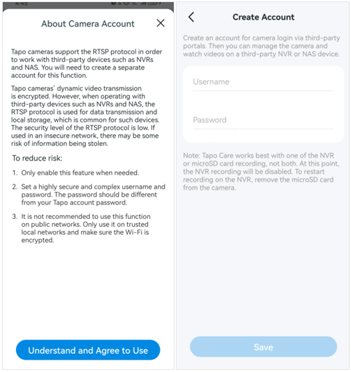 - Read the Camera Account notice and tap Understand and Agree to Use. Then create your camera username and password. Both must be between 6 to 32 characters. Use a strong, unique password that is different from your Tapo account password.