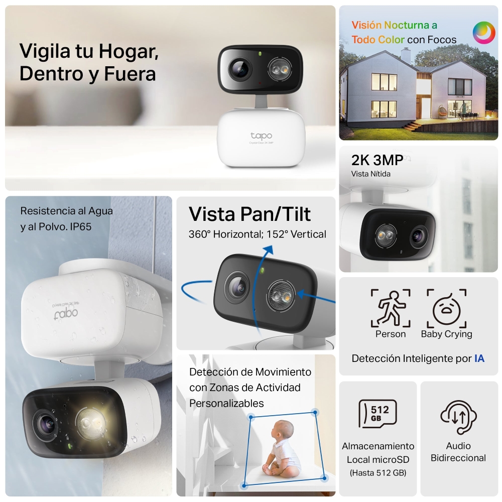 - Seguridad para tu hogar. En todo lugar y a toda hora: Disfruta de una colocación flexible en interiores o exteriores. Obtén protección total con una vista en vivo de 2K 3MP, que muestra colores vívidos incluso de noche.