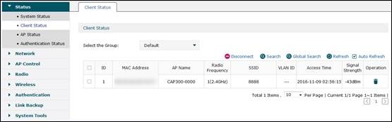 Step5. After all configurations, we can check CAP’s status in AC controller’s “AP Status” page. Here the following screenshot shows the CAP in VLAN2 (192.168.1.0/24) subnet managed by AC controller in VLAN 1 (192.168.0.0/24) subnet.