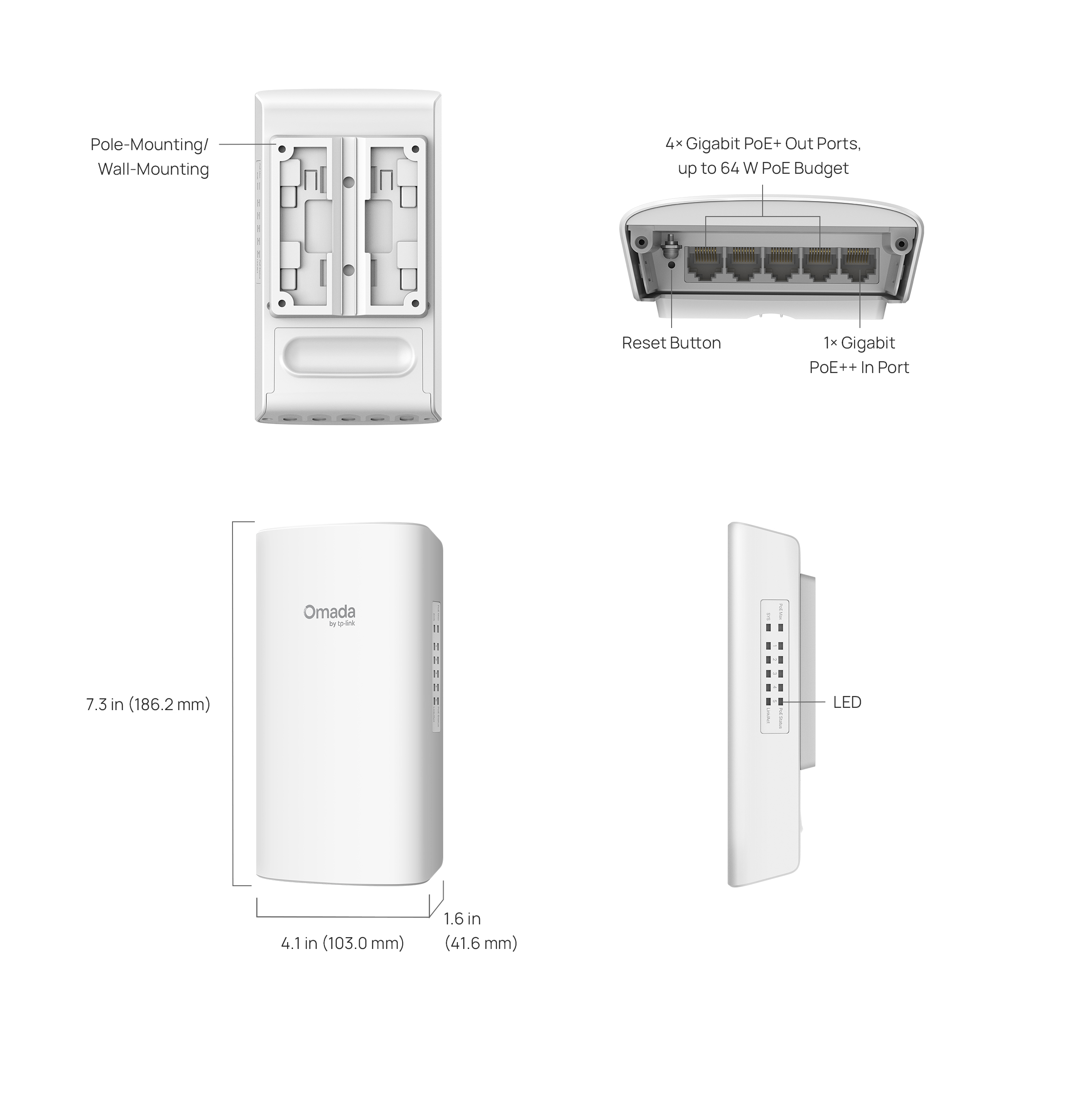 - 1× gigabit PoE++ in RJ45 port and 4× gigabit PoE+ Out RJ45 ports