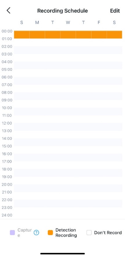 2) Tap Schedule to go to the Recording Schedule page. Tap Edit to configure the Capture and Detection Recording time periods.