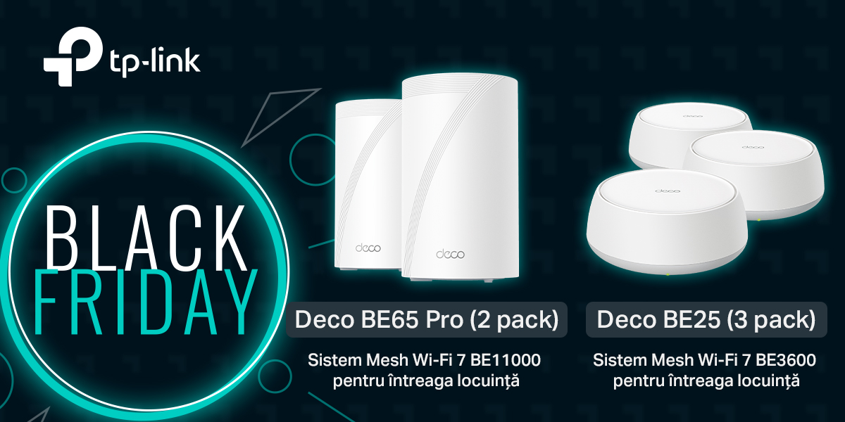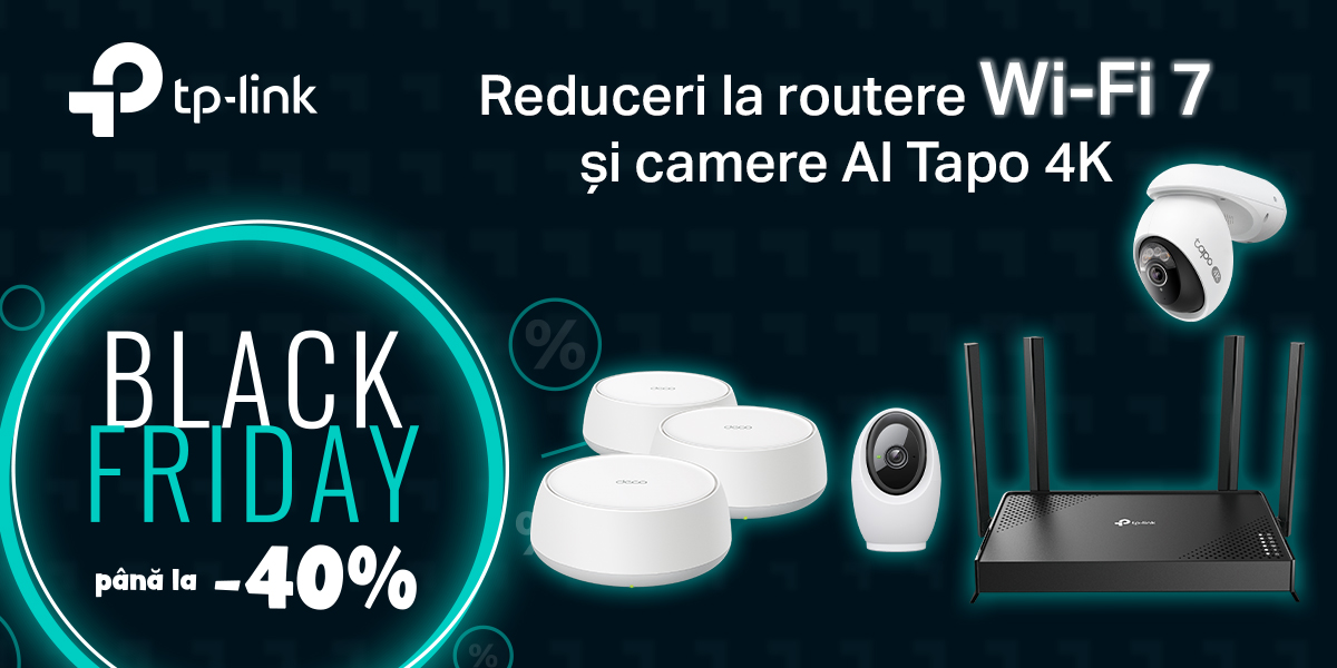 TP-Link vine cu reduceri de până la 40% de Black Friday la unele dintre cele mai performante produse din portofoliul său. Fie că este vorba dispozitive cu cea mai nouă tehnologie Wi-Fi 7 sau despre camere inteligente de supraveghere cu 4K 8MP, cei interesați pot profita de ocazie pentru a-și transforma complet experiența de conectare și confortul de acasă.