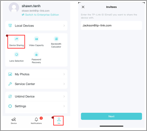 - Tap Share. Enter the invitee’s TP-Link ID, then tap Next.