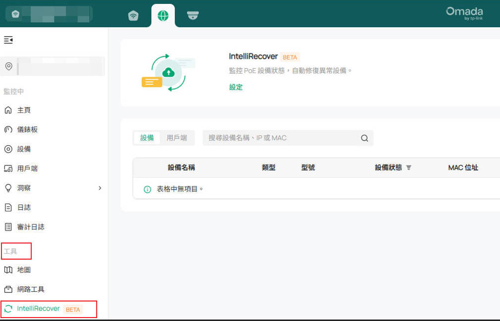 步驟 1. 透過網頁瀏覽器登入 Omada Central , 前往 工具 > InterlliRecover