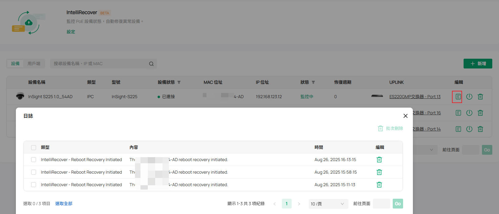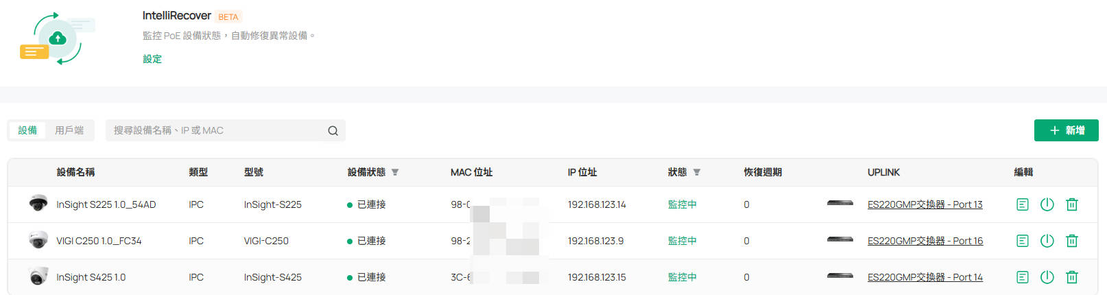 IntelliRecover是一項整合設備狀態監控和自動恢復機制的功能,增強網路設備的自癒能力,減少人工干預,此功能適用於所有 PoE 供電的終端設備。