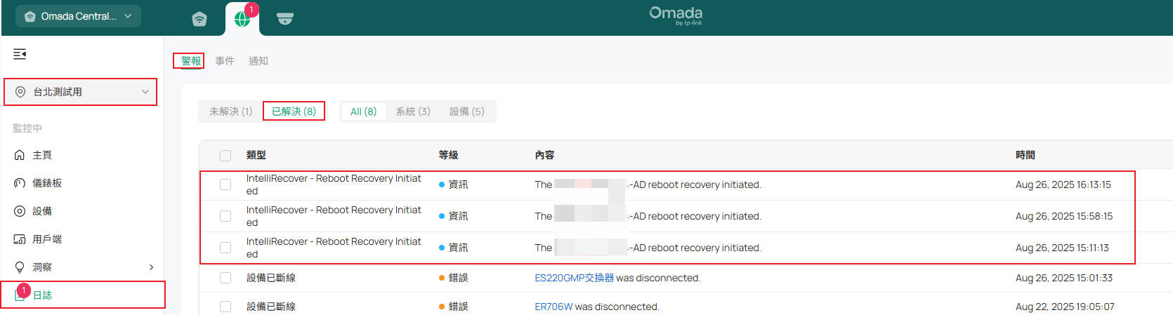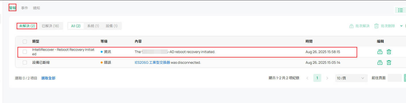 1. 當設備觸發 IntelliRecover 時,日誌將顯示復原是否成功或失敗。