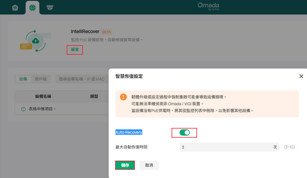 Step 2. 點擊 設定 並啟動Auto Recovery,並可設定最大自動恢復時間 後點擊 儲存