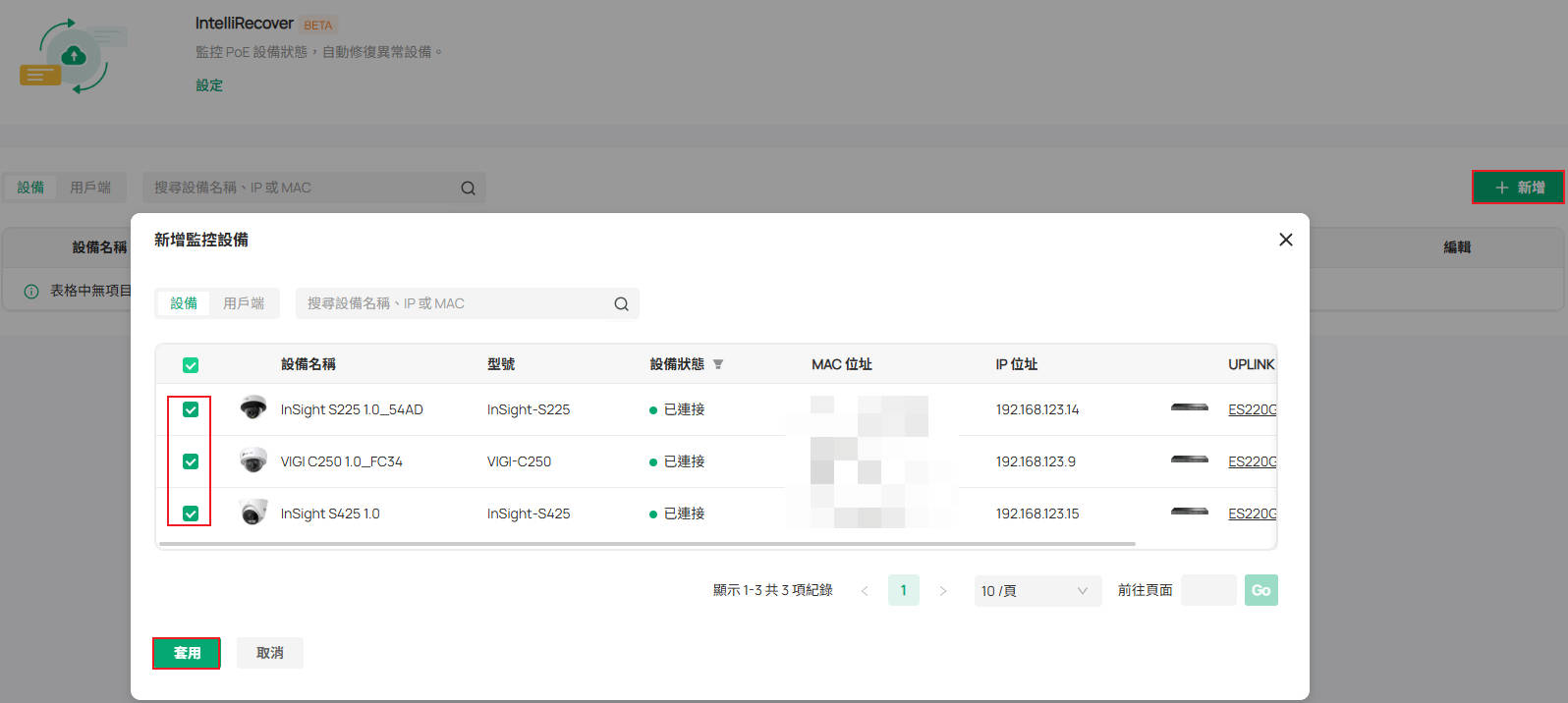 步驟 3. 點擊 新增, 選擇需要啟用IntelliRecover功能的設備後套用