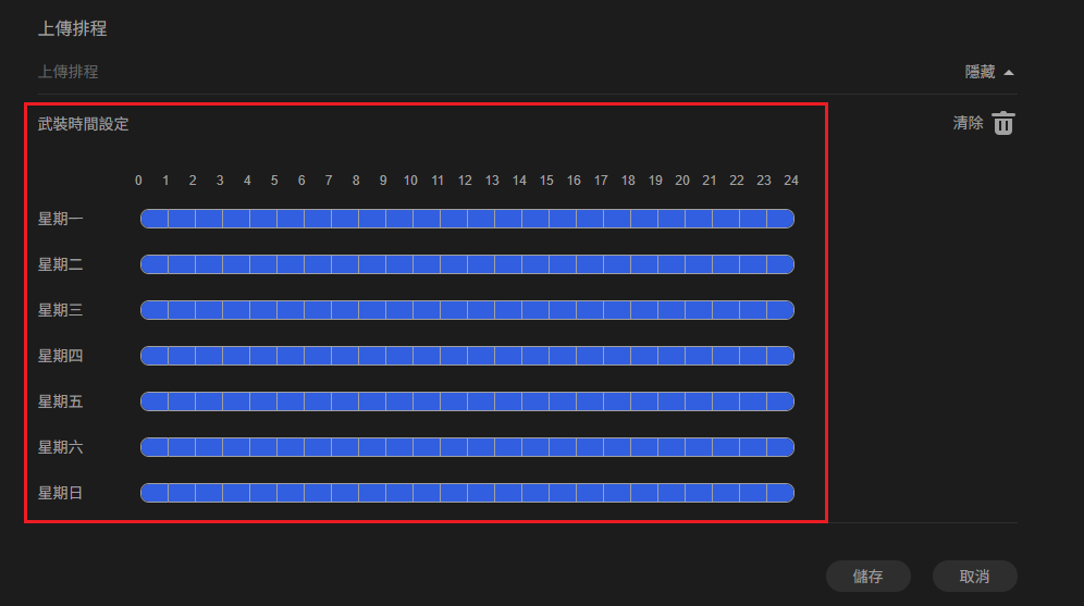 選擇儲存以儲存設定並啟用設定,NVR隨後將根據定義的佈防排程上傳資料。
