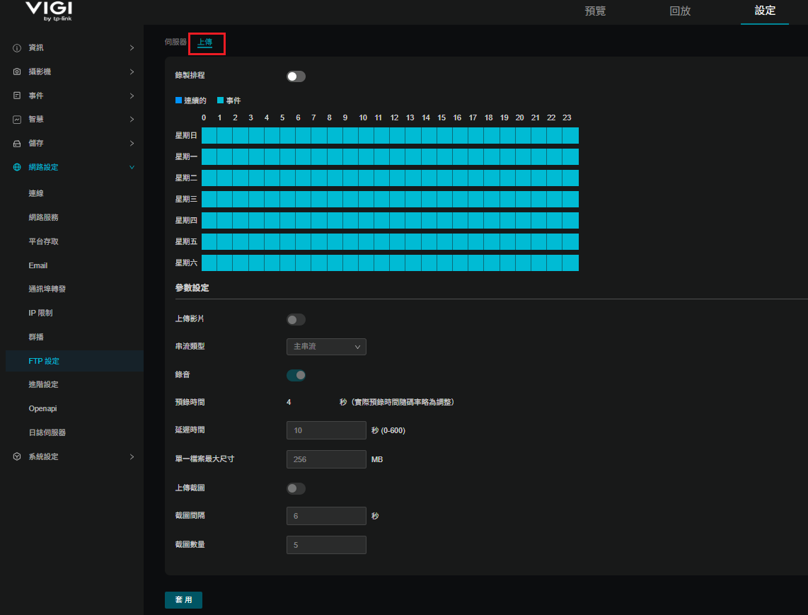 在錄影排程下設定的每個時段,決定了是要依設定的間隔上傳連續錄影或事件觸發的錄影和圖片,或是停用上傳。