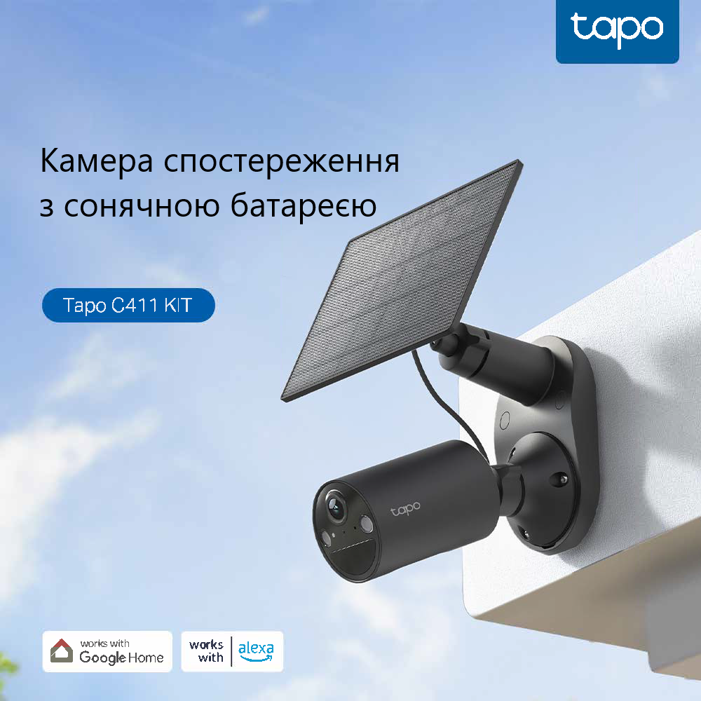 Tapo C411 KIT — комплект відеоспостереження, який забезпечує повну бездротову автономність завдяки живленню від сонячної панелі.