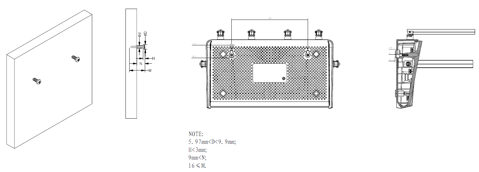 螺絲頭直徑為5.97mm<D<9.9mm,兩個螺絲之間的距離為160mm。從牆壁突出的螺絲需要約9mm的基底,並且螺絲的長度至少需要16 mm才能承受產品的重量。