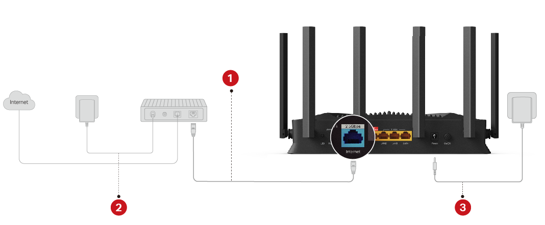 If your internet comes from an Ethernet outlet instead of a DSL / Cable / Satellite modem, connect the router’s 2.5 Gbps Internet port to it, then follow step 3 and 4 to complete the hardware connection.