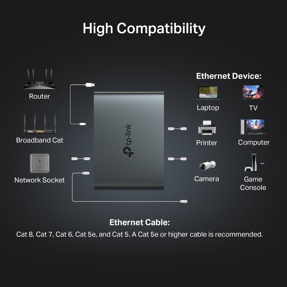 Compatible with Cat 8/7/6/5e/5 Ethernet cables and works with common Ethernet devices, including routers, switches, computers, TVs, and game consoles.