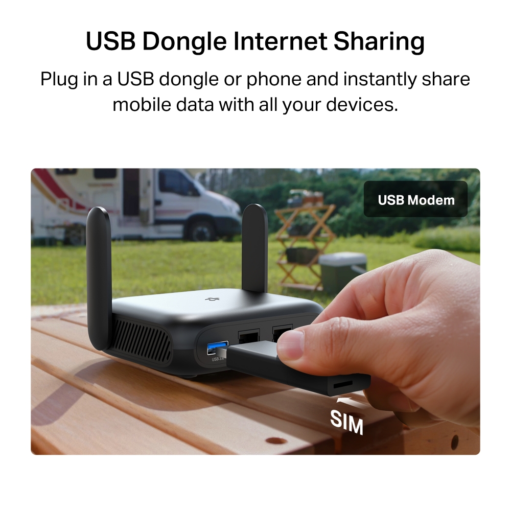 OpenVPN & WireGuard Connect up to 80 Devices 7 Flexible Operating Modes Router · Hotspot · USB Tethering · USB Modem · AP · Range Extender · Client Two Adjustable Antennas for Broader Coverage 1-Step Captive Portal Authentication Charge it with a power bank 2.5G Multi-Gig Ethernet Port Easy Setup with Tether App
