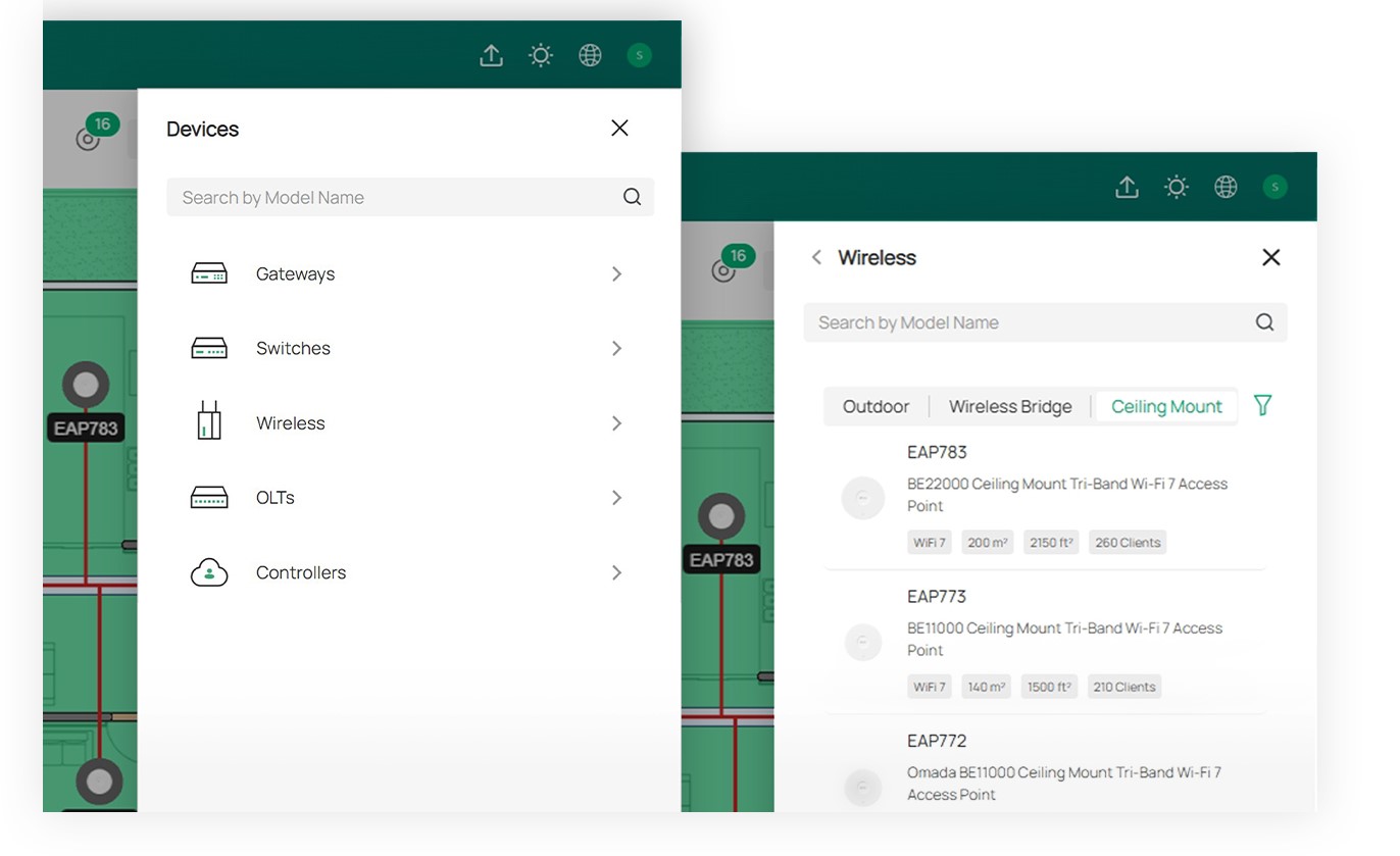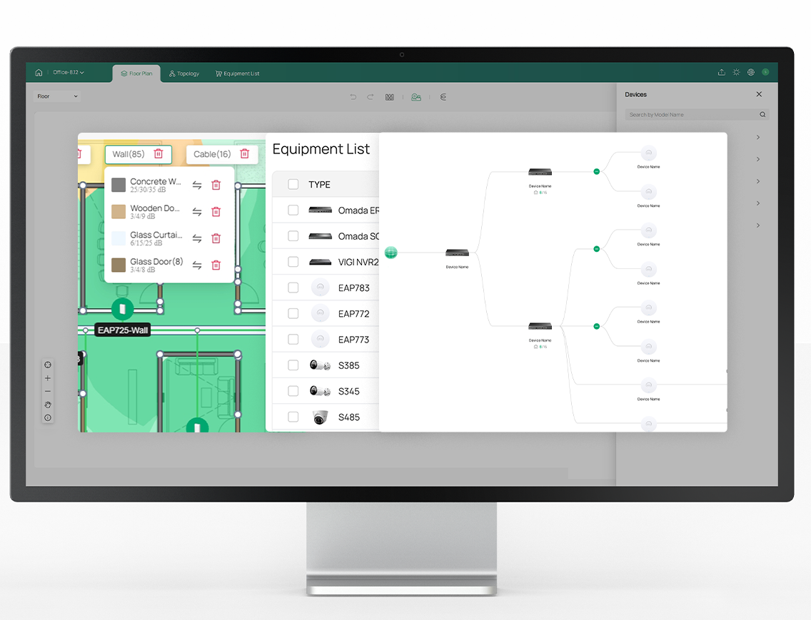 To support precise and deployment-ready simulations, Omada Design Hub offers flexible customization and a comprehensive equipment portfolio. Fine-tune wall types, cable preferences, scale, and display settings, and choose from Omada gateways, switches, APs, OLTs, and controllers to ensure results reflect real-world deployments for more reliable insights.
