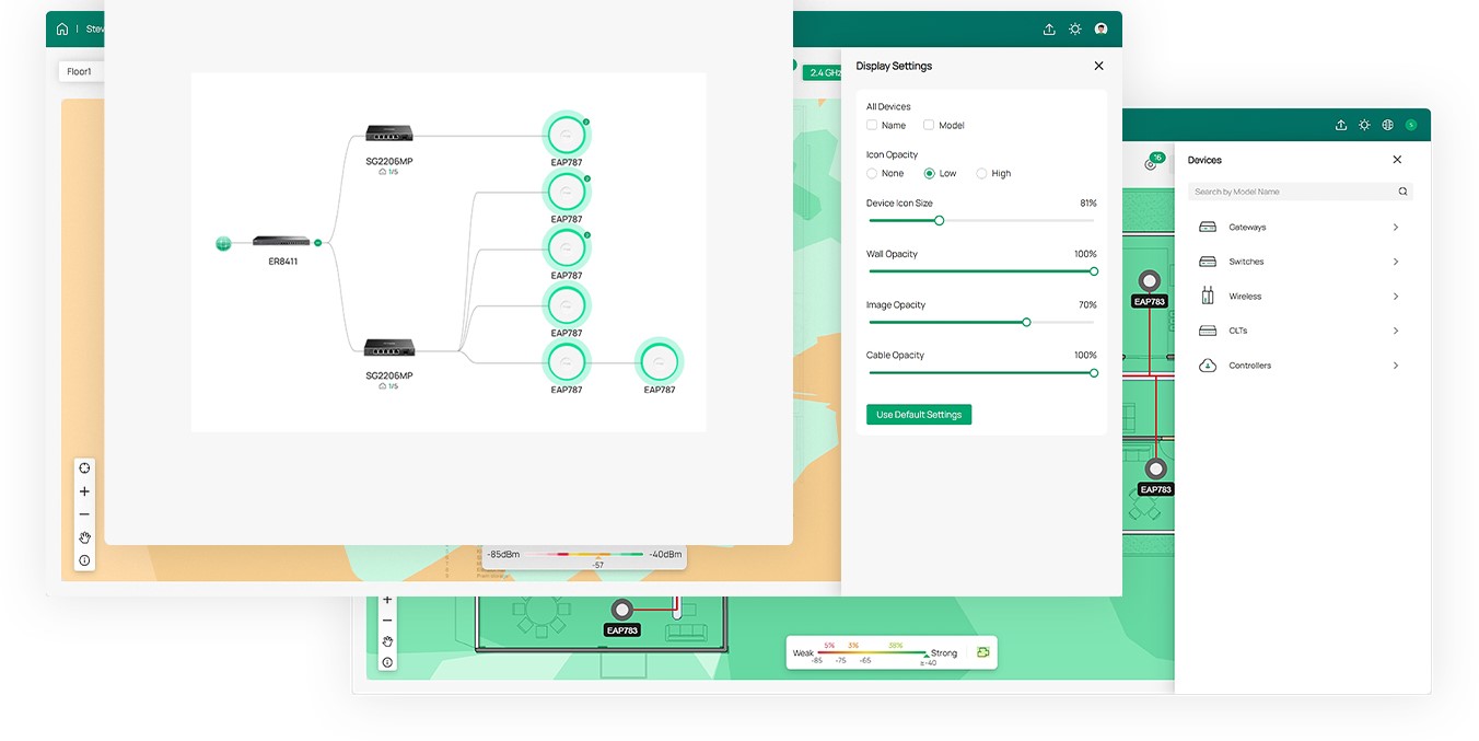 To support precise and deployment-ready simulations, Omada Design Hub offers flexible customization and a comprehensive equipment portfolio. Fine-tune wall types, cable preferences, scale, and display settings, and choose from Omada gateways, switches, APs, OLTs, and controllers to ensure results reflect real-world deployments for more reliable insights.