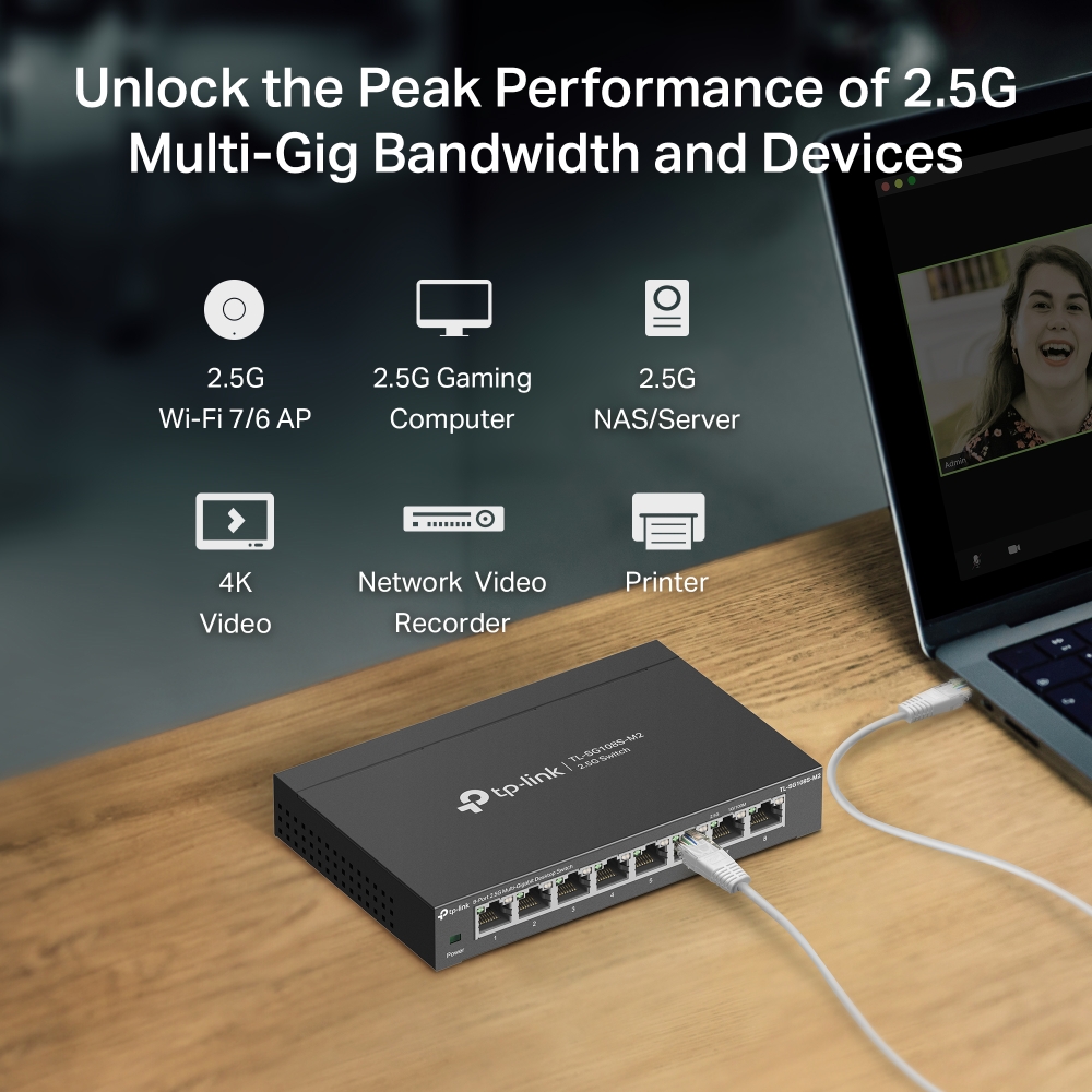 This switch delivers 2.5 times faster network performance than traditional Gigabit switches. It works with CAT5e, CAT6, CAT6a and above cables without upgrading your cabling.