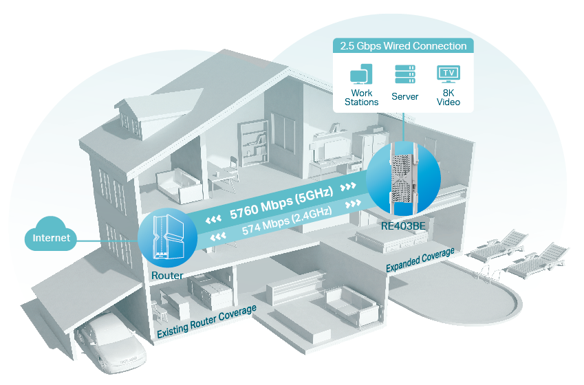 6.3 Gbps Dual-Band Wi-Fi Multi-Link Operation (MLO) enables RE403BE to transmit data with Wi-Fi 7 clients across the 5 GHz and 2.4 GHz bands simultaneously, delivering faster Wi-Fi speeds than Wi-Fi 6/6E range extenders.△ |