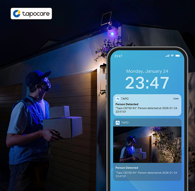 Receive notifications with detection snapshots, encrypted protection, data backups, and up to 30 days of video history with Tapo Care cloud services (subscription required).