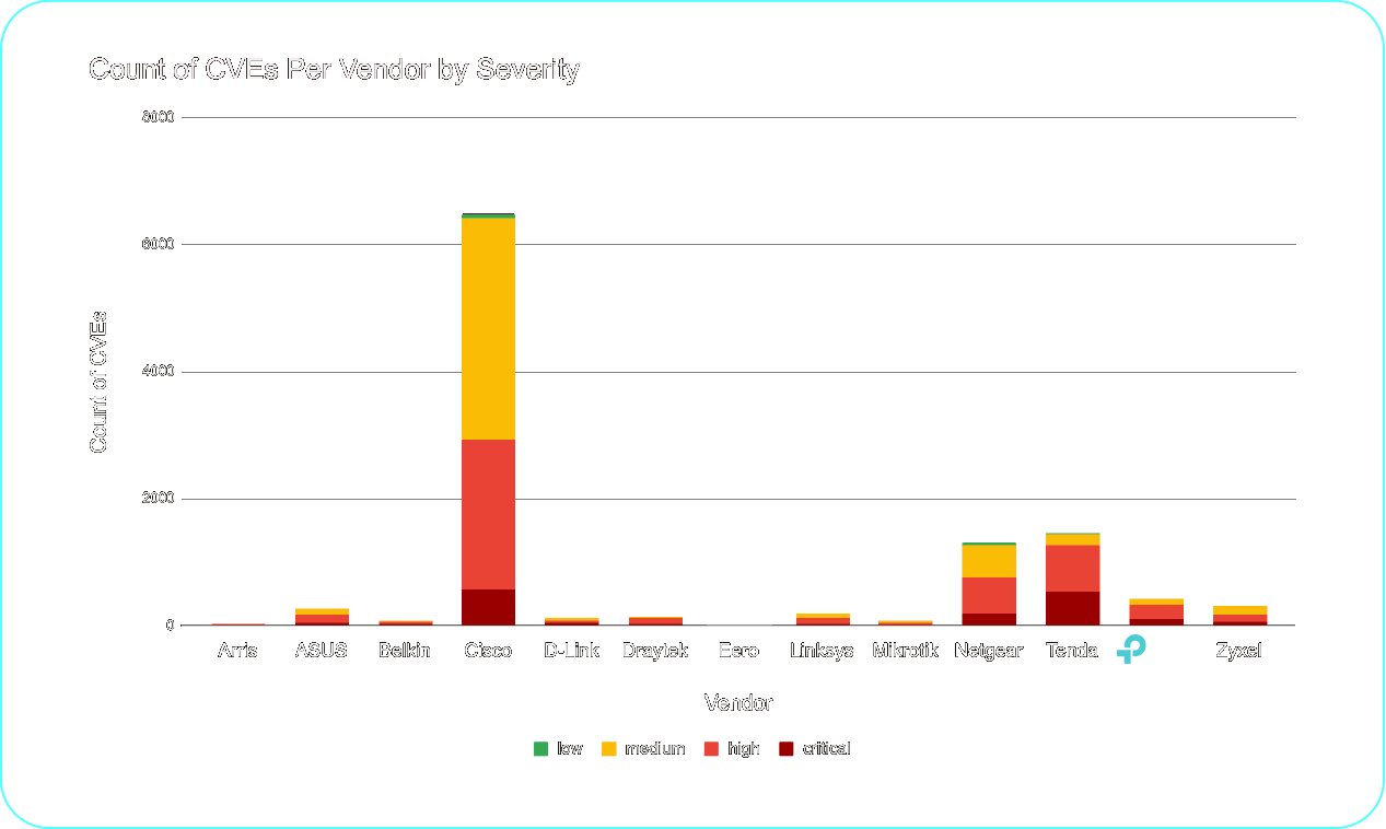 TP-Link's severity distribution is evenly balanced across Medium, High, and Critical categories, consistent with most other vendors.