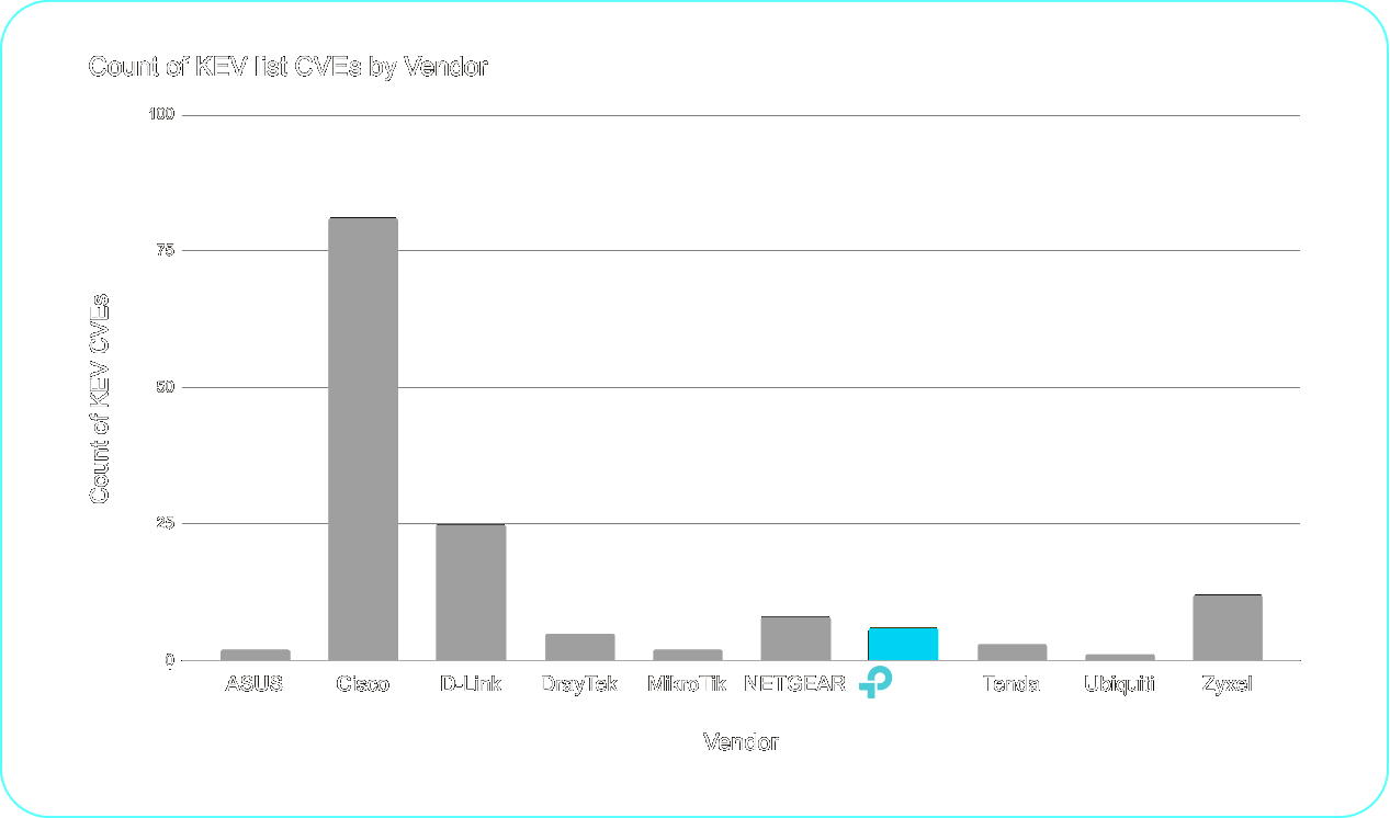 As shown in Figure 3, TP-Link's KEV count is in line with several competitors, but some industry outliers have notably higher counts. For example, Zyxel has approximately twice TP-Link's KEV count, and D-Link has approximately twice again as many.