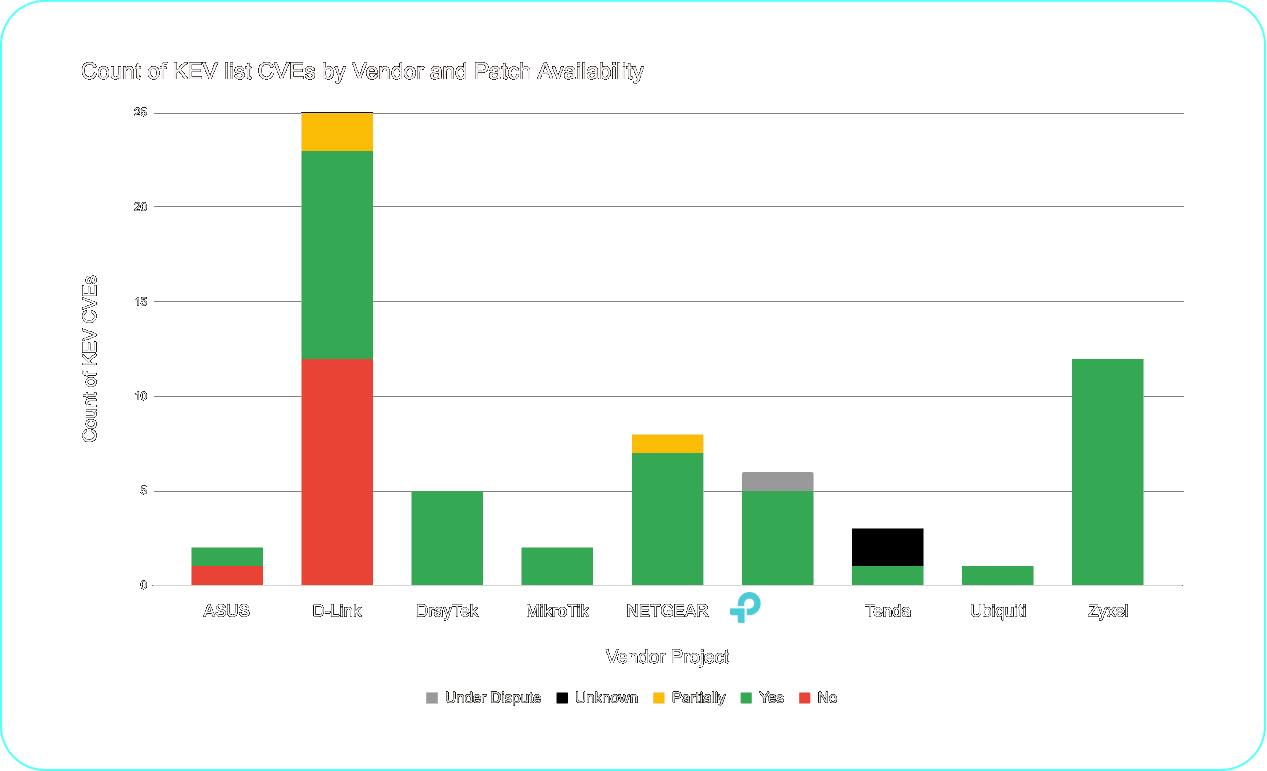 As shown in Figure 4, TP-Link has provided patches for all KEV-listed vulnerabilities (except for one where TP-Link is disputing the validity). This practice is not uniform across the industry, and in particular some suppliers do not issue patches for KEVs associated with end-of-life devices.