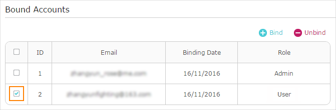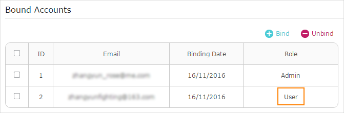 4.The new TP-Link ID will be displayed in the Bound Accounts table as a User.