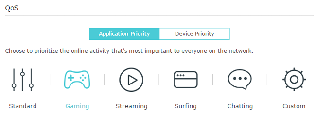 3.In the Application Priority tab, click Gaming to prioritize this online activity. The default is Standard, with no application prioritized.
