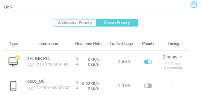 4.In the Device Priority tab, find your computer and toggle on Priority. Click the entry in the Timing column and select 2 hours as the duration you want the device to be prioritized for.